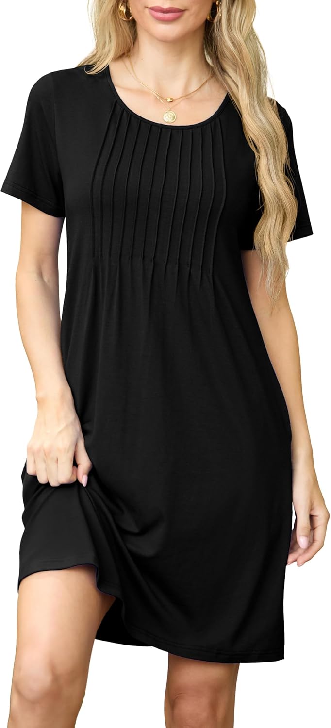 GRECERELLE Womens Summer Mini Dress Casual Short Sleeve Crew Neck Pleated Dresses with Pocket for Ladies