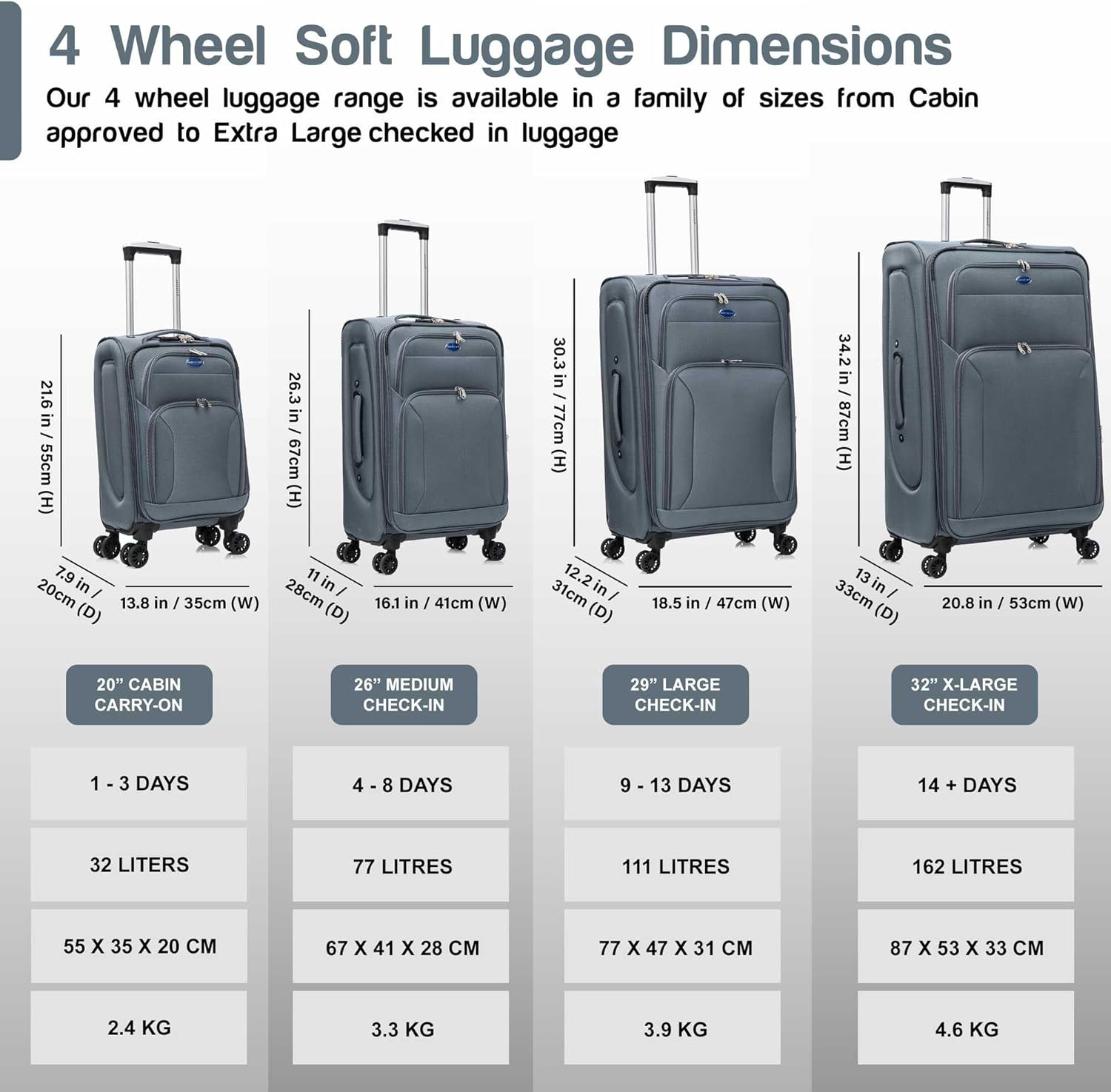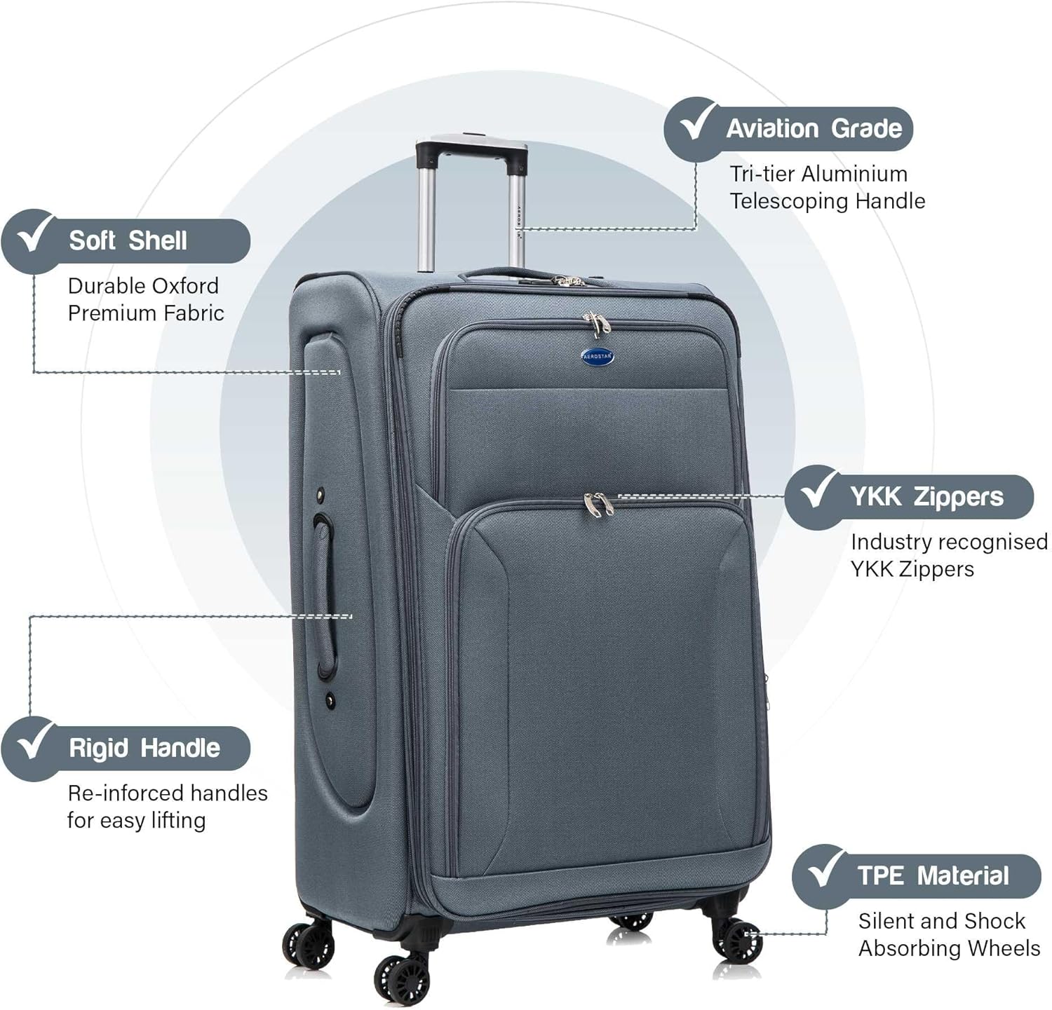 Description: Aerostar 4 wheels lightweight soft shell check in Luggage & carry on suitcase. Fashionably designed to make you look chic and stylish, matched with robust quality to endure all your travel needs. Elevate your travel experience with our premium selection of suitcases and luggage! Whether you’re a jet-setter or an occasional traveller, we have the perfect travel companions for you.