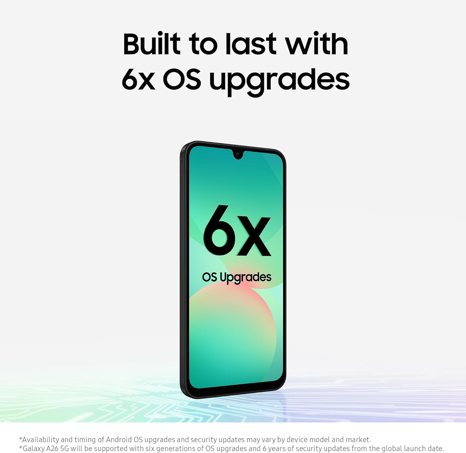 Stay Updated: Stay up to date with 6 generations of OS upgrades and 6 years of security updates to keep your Galaxy A26 5G Mobile secure and performing at its best.¹¹ ¹²