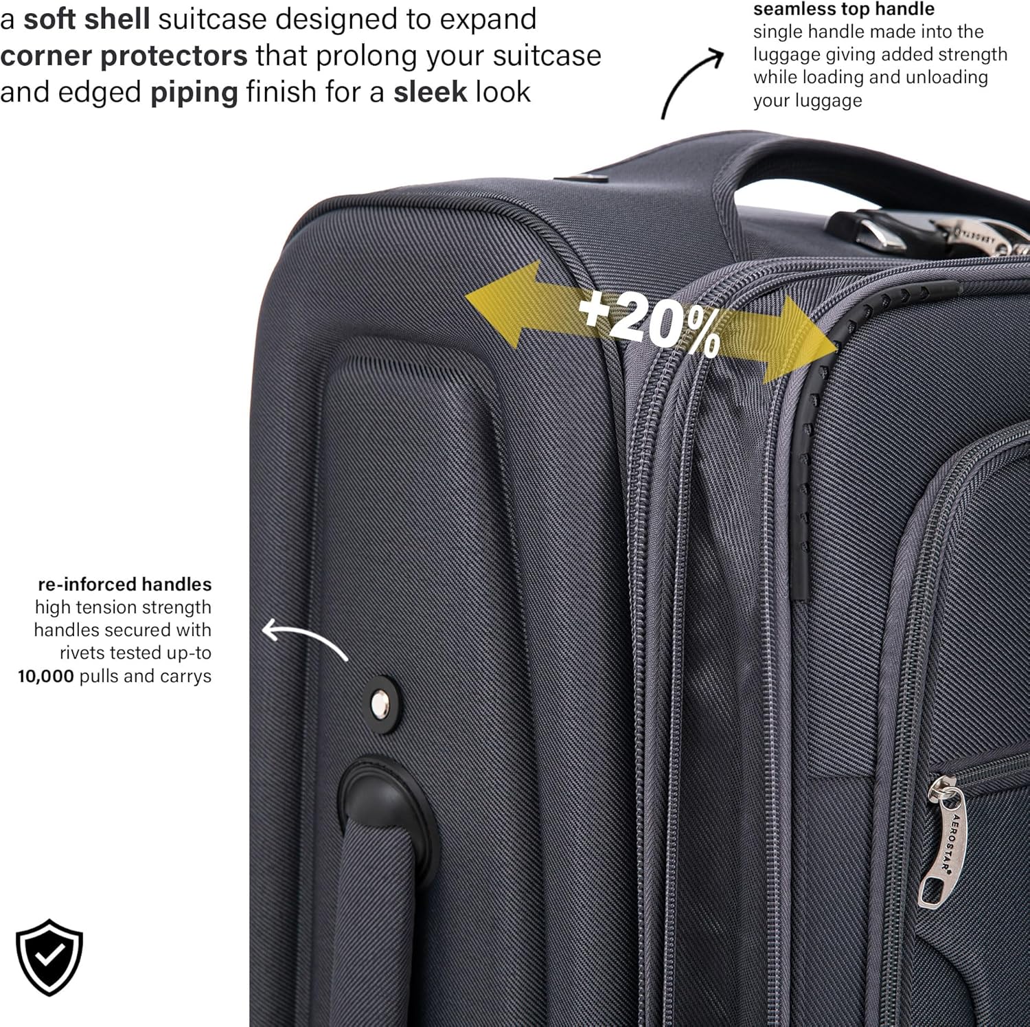 Gray wheeled suitcase with soft shell, YKK zippers, and TPE material handles. Features include aviation grade telescoping handle and durable construction for travel.Gray wheeled suitcase with soft shell, YKK zippers, and TPE material handles. Features include aviation grade telescoping handle and durable construction for travel.