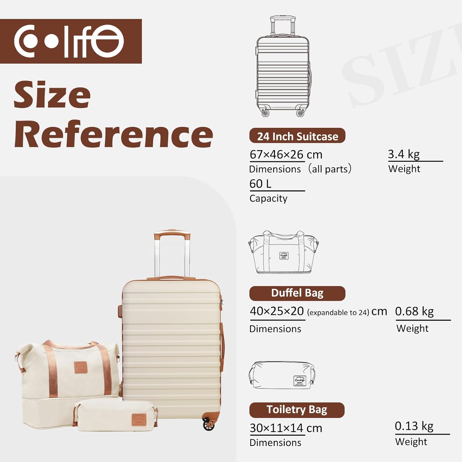 All-in-One Travel Companion: Lightweight yet spacious, COOLIFE 3 pcs luggage set features a 24 inch medium suitcase (67x46x26cm), a stylish travel duffel bag, and a sleek toiletry bag—everything you need to pack smart and travel light. Say goodbye to heavy, cumbersome bags and hello to effortless, stress-free adventures
