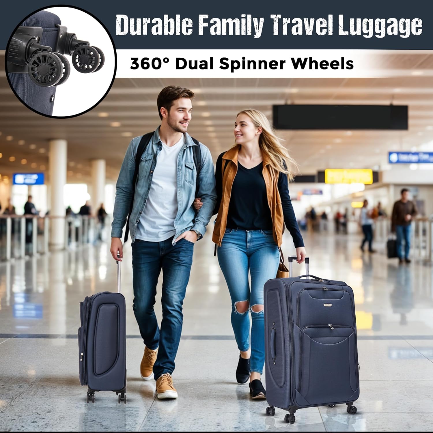 Navy blue expandable suitcase with telescopic handle, spinner wheels, side handles, and reinforced zipper. Features built-in lock, stain-resistant material, and multiple compartments for organized packing.Navy blue expandable suitcase with telescopic handle, spinner wheels, side handles, and reinforced zipper. Features built-in lock, stain-resistant material, and multiple compartments for organized packing.