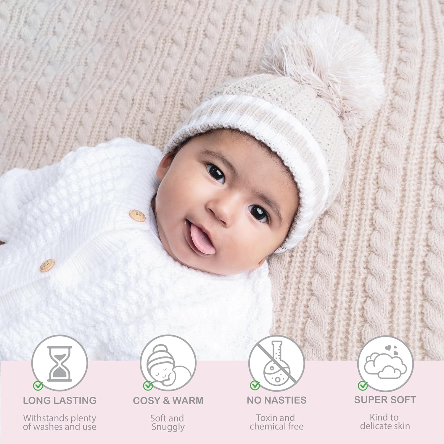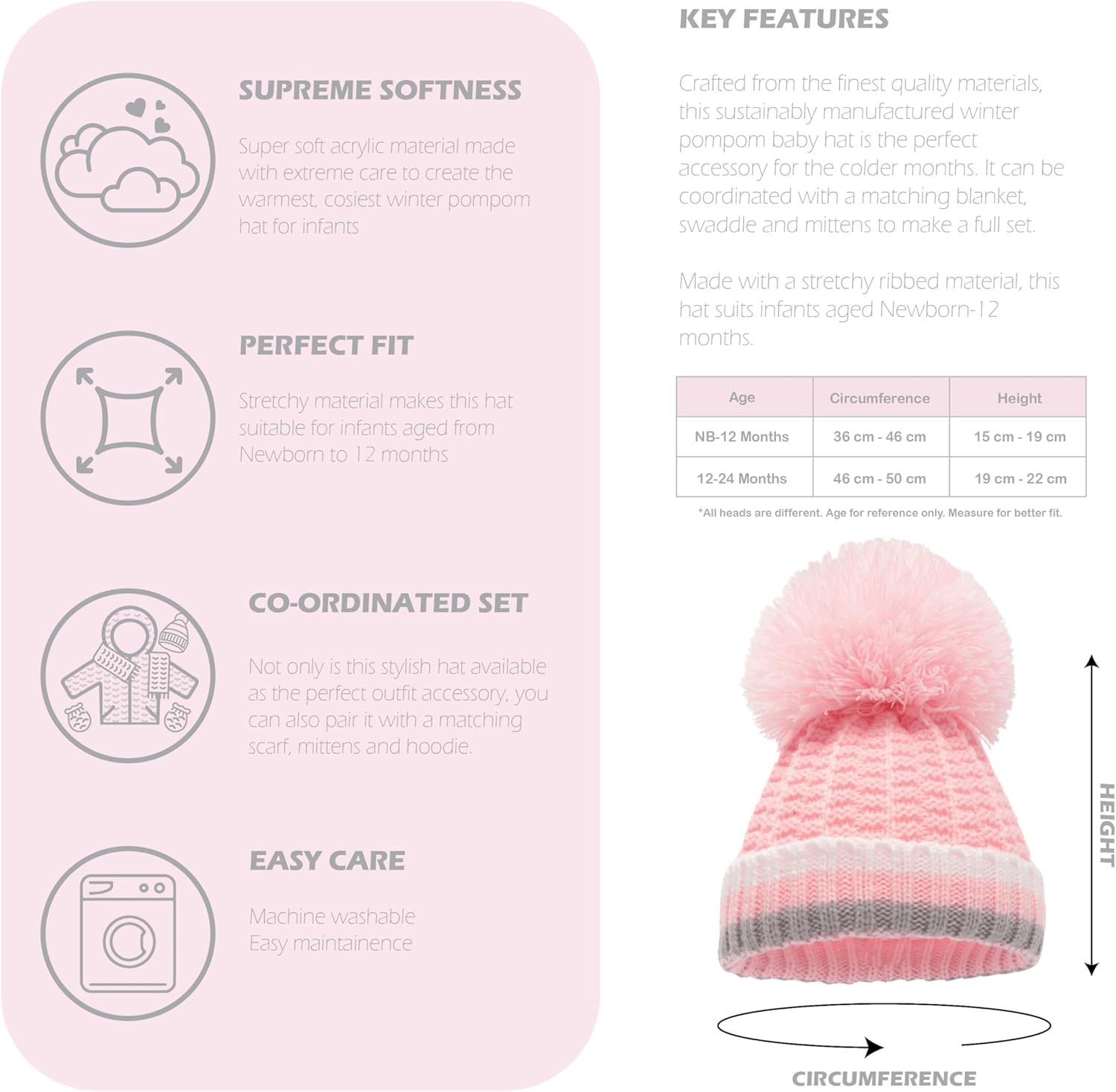 Description Baby Boys Girls Knited Pom Pom Hat & Mitten Set Plain Hat With Turnover & Mittens Set Keeps Head And Ears warm Knitted Hat, Good for the cold Weather Size NB-12 Months Colour Sky Blue, Pink & White Material 100% Acrylic Colour: As Image (Colour May Be Slightly Different From Image)