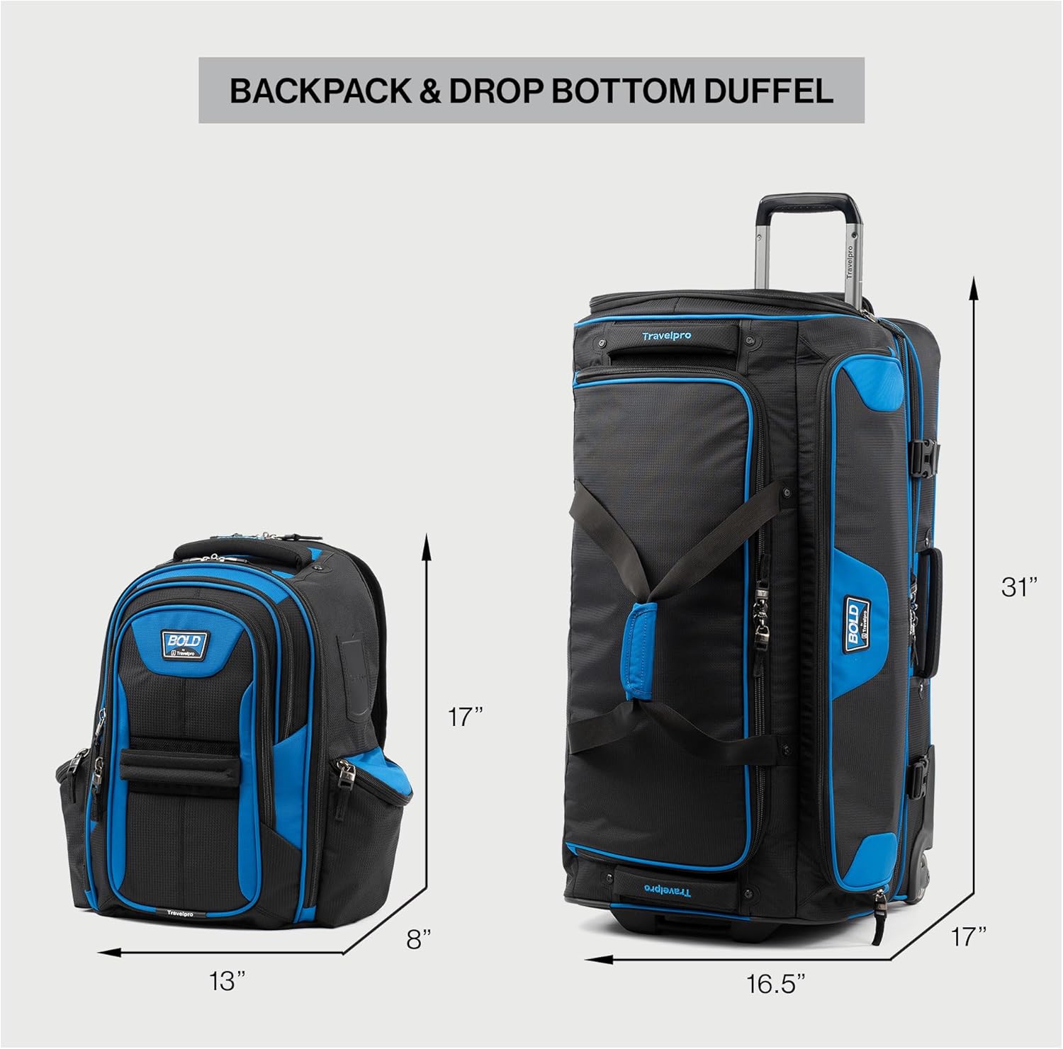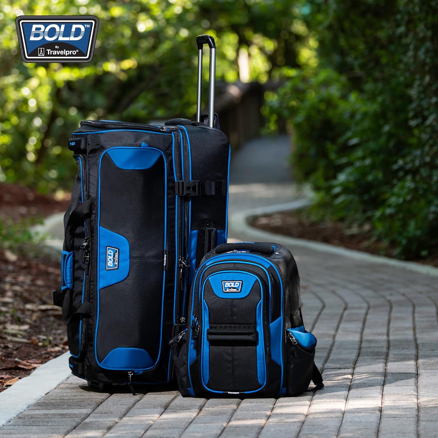 Pack everything you need–and more—with this rugged yet lightweight Bold™ by Travelpro® two-piece set, which pairs a handsome computer backpack with a 25” expandable Rollaboard® that is check-in-sized for longer adventures. Built to withstand daily use and abuse, these bags are constructed with highly durable, high-density polyester fabric treated to resist moisture and stains, then backed by our Travelpro® Built For A Lifetime Limited Warranty with the Trusted Companion Promise. The computer backpack is great for travel and everyday use with a padded laptop sleeve and padded tablet sleeve conveniently accessible through exterior zippers. Dual side pockets are designed to hold a water bottle, umbrella, phones, keys, and other necessities. Breathable back padding and adjustable shoulder straps provide long-wearing comfort, plus neoprene handles add further carrying options. For ultimate mobility, a rear strap fits over the Rollaboard® handle for secure stacking. The Bold™ by Travelpro® 25” Expandable Rollaboard® combines unique styling with durable yet lightweight construction and a zippered 2” expansion option that boosts capacity, making this the ideal checked bag. Added organizational features include adjustable hold-down straps, a mesh pocket inside the lid, and a large wet pocket to keep damp or dirty items away from other contents. Cushioned handles make carrying comfortable or hit the road on two high-performance ball-bearing inline skate wheels led by a strong, adjustable-height telescoping handle made of aircraft-grade aluminum. Reinforced wheel housings, skid guards, and molded corner guards protect high wear points to keep the bag looking great no matter where you roam. Exterior compression straps provide added security and adjust to condense the bag’s depth when needed.