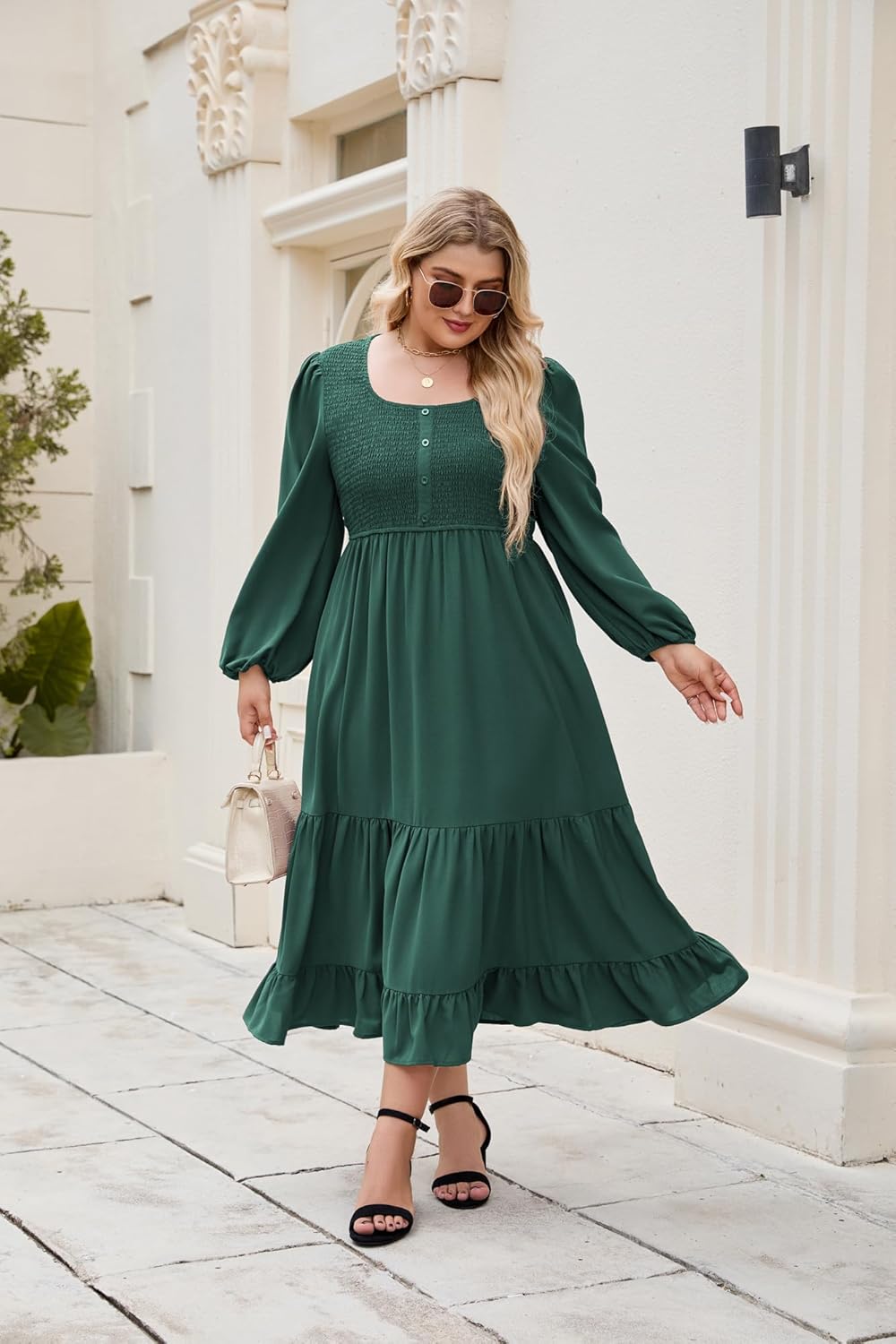 Women’s autumn dress, long sleeves, ruched chest, long length, A-line, square neckline, decorative button detail