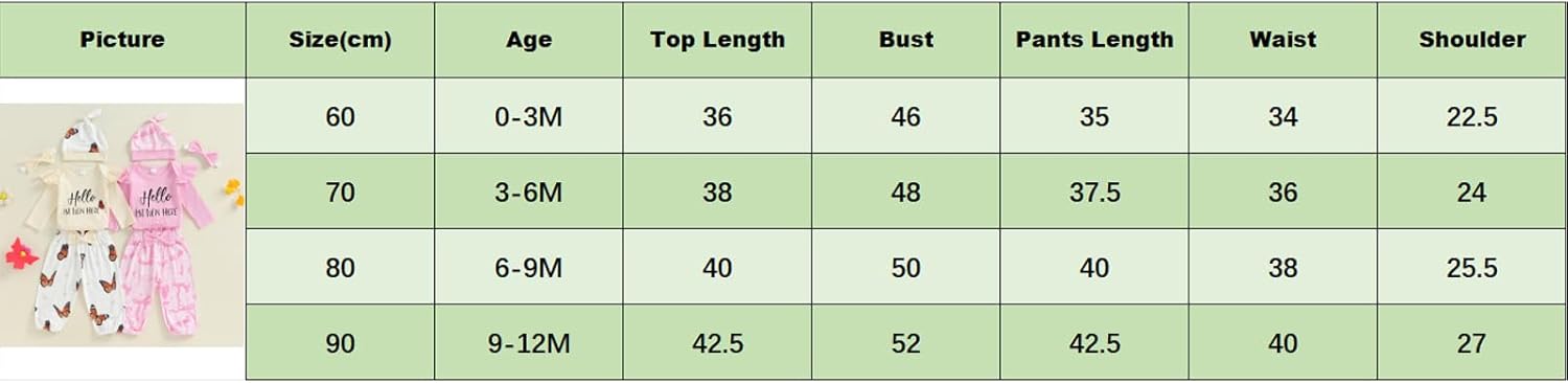 0-3M Tops Length: 36 Bust: 42 Sleeve: 23 Shoulder: 18 Pants Length: 35 Waist: 35 Hip: 50 Advised Age: 0-3 Months