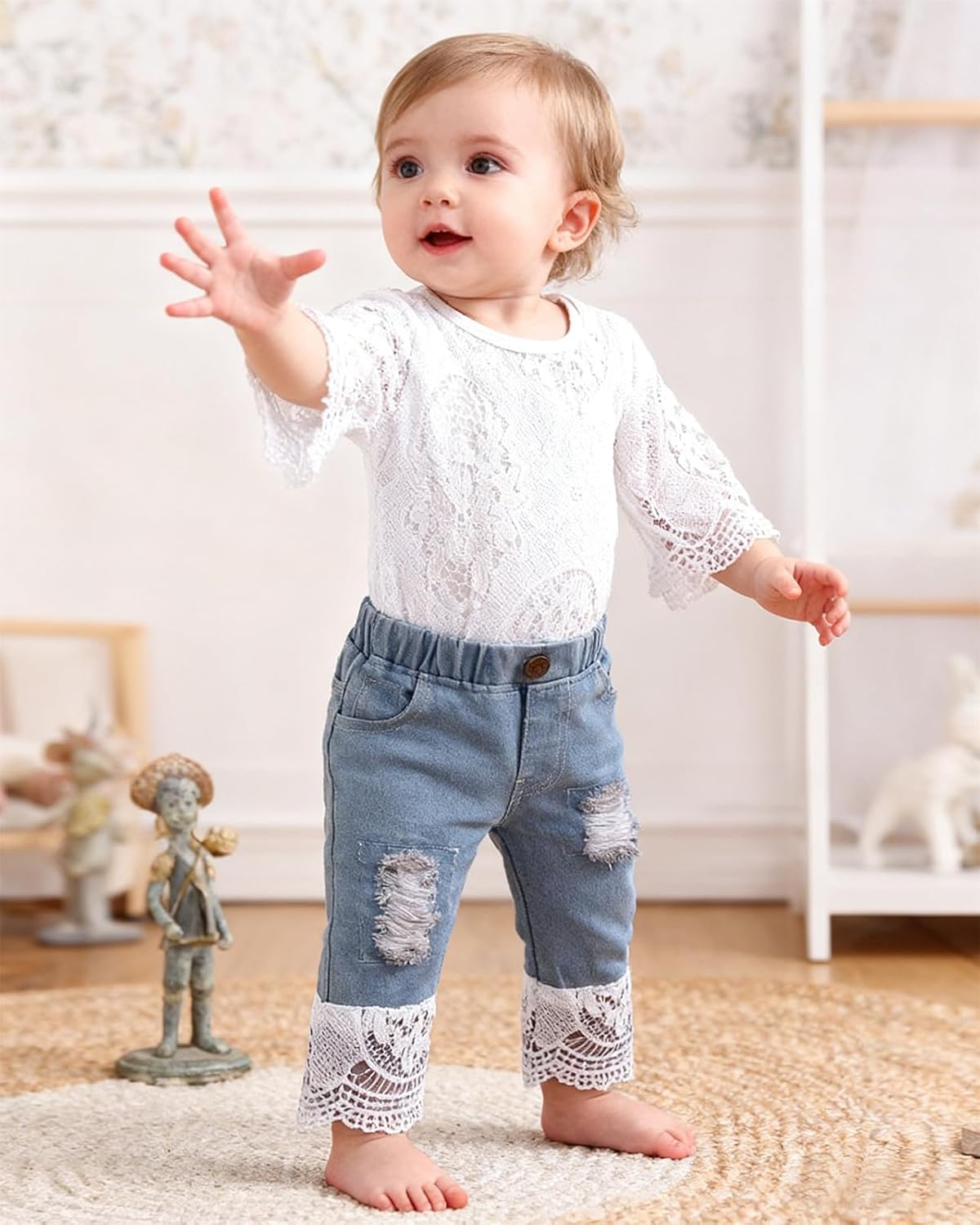 Baby Girl Lace Clothes Outfit for Newborn Long Sleeve Tops Romper for Infant Toddler Ripped Denim Jeans Outfits