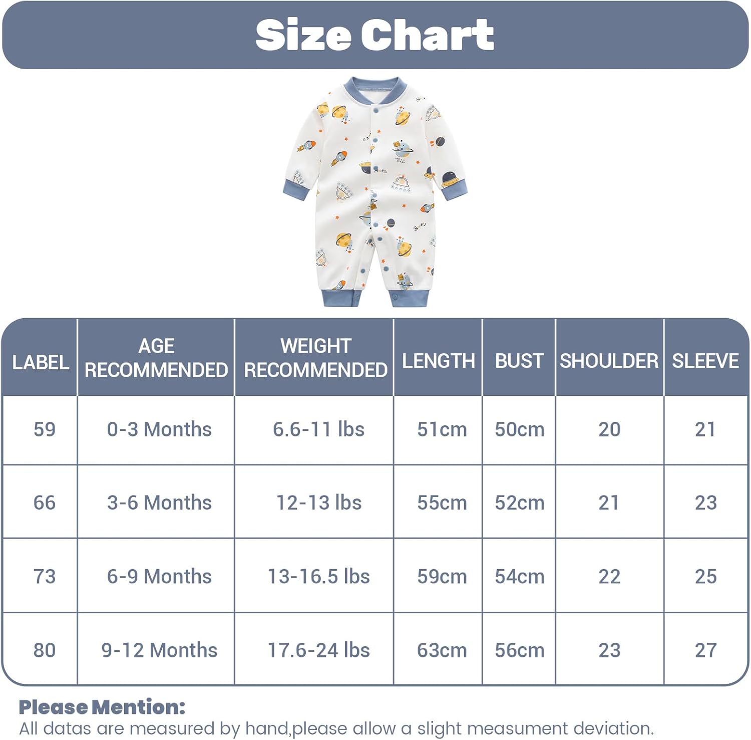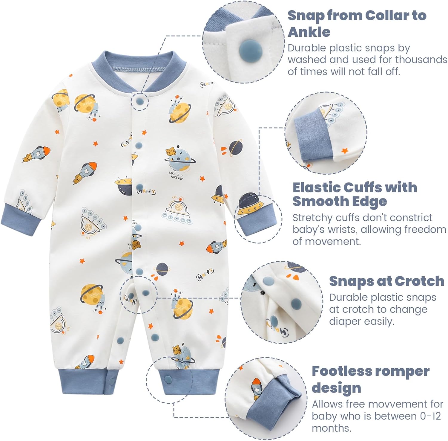 Baby Rompers Boys Girls Cotton Overalls Long Sleeve Jumpsuit Pyjama, 0-12 Months