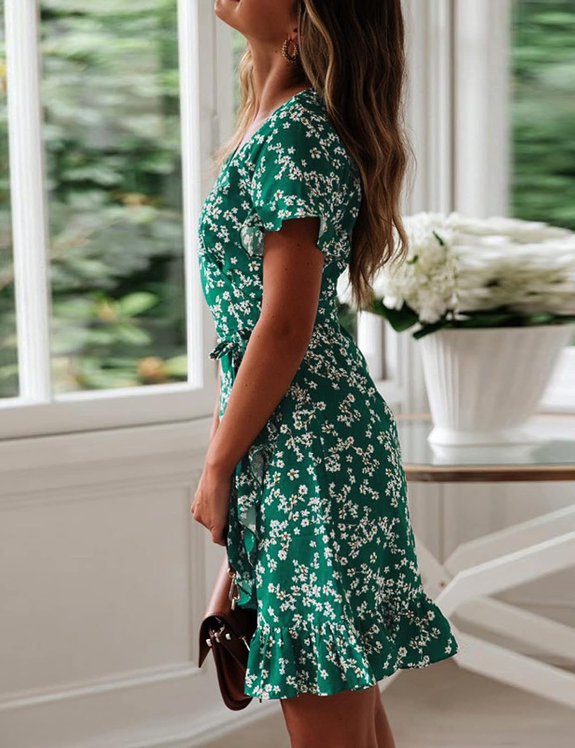 Beach Wrap Dress Women Chiffon V Neck Flower Print Short Sleeves