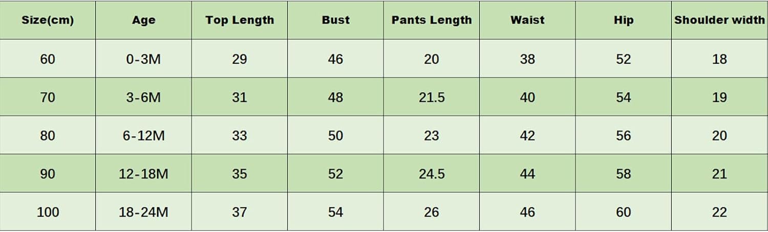 3-6M Tops Length: 11.81 Bust: 18.11 Pants Length: 8.27 Waist: 14.96 Hip: 20.47 Advised Age: 3-6 Months