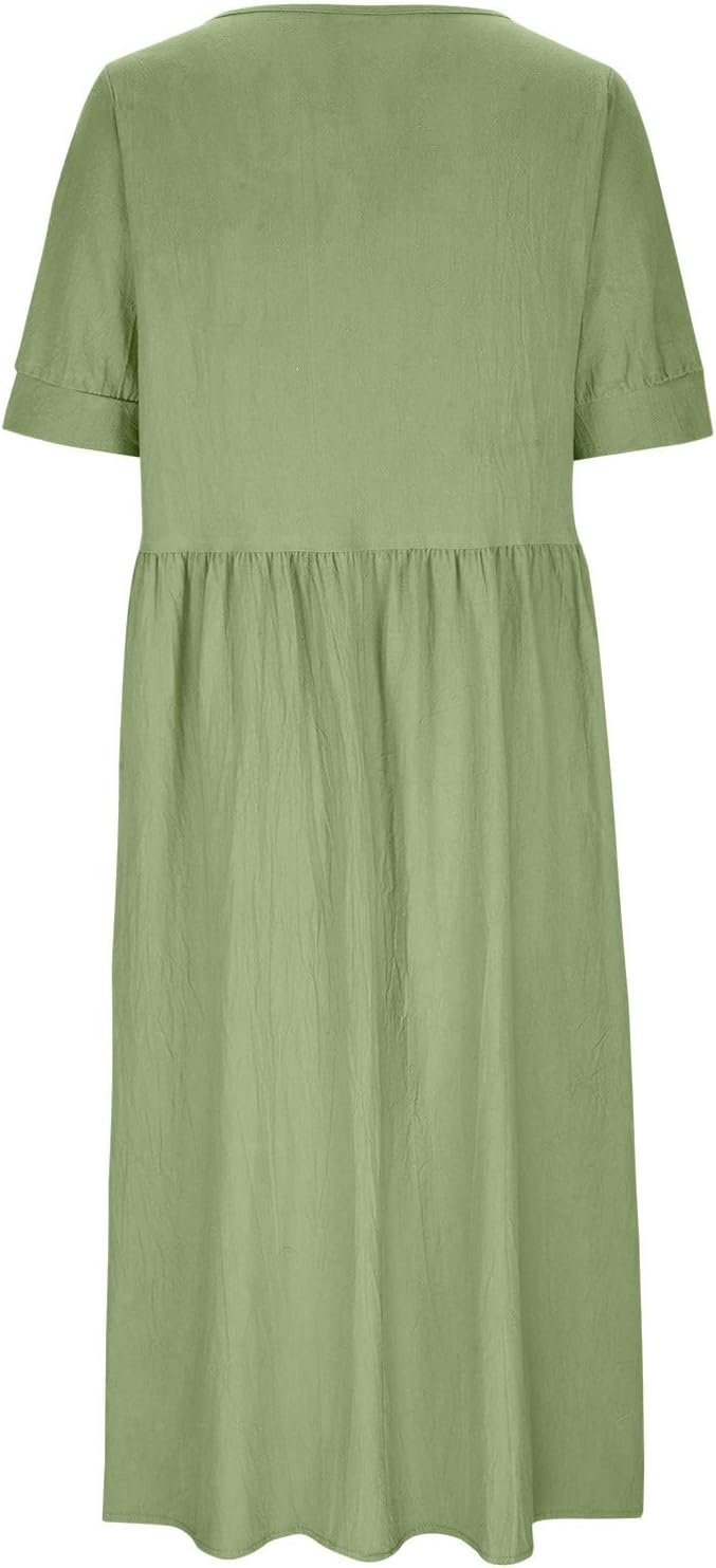 UK Clearance Women’s Summer Cotton Linen Dresses – Short Sleeve Midi Dress with Pocket – Casual Pleated Oversized Solid Holiday Party Beach Dress – Elegant Shift Sundress